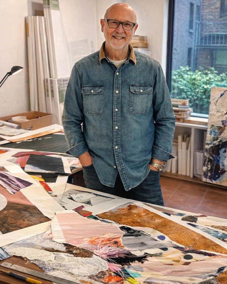 For many years, inspired by Wabi-sabi, the Japanese philosophy that values the beauty of things imperfect, impermanent, and incomplete, I have been photographing the aged and weathered billboards that are indigenous to cities around the world. These photographs of torn and tattered walls serve as the source material of my collages. My process involves making large prints of the photographs and tearing the prints into pieces that I then reconfigure and glue onto canvas. As I build the relationships between the pieces I am also developing what I call “the composition in the chaos.” The narrative is simply about shapes, colors, textures, patterns, and how they juxtapose. I love the trompe l’oeil effect; many of the rips, creases and bubbles are in the photographs but others are real. Various light sources exist within the same space but the eye allows it. For me, making a collage is like putting together a jigsaw puzzle: all of the pieces must fit, but it isn’t complete until the final piece is in its proper place. I hope the result intrigues and delights the viewer.